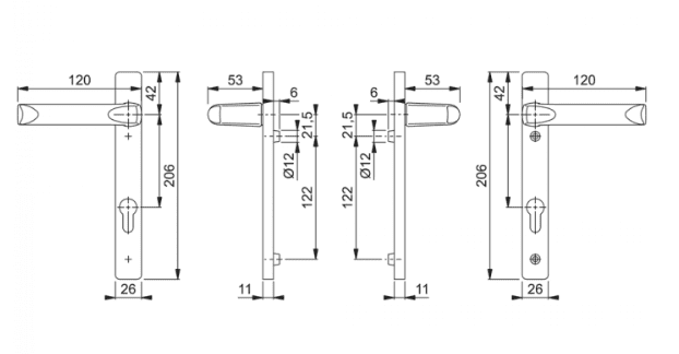 The Hoppe London 113/366M is an aluminium handle on a narrow backplate set for profile doors which is tested to DIN EN 1906: 26-0040A (Category of use grade 2) with 122mm screw fixing centers. It has a maintenance-free slide bearing, M5 bolt through fixings and comes complete with fixings and spindle.
