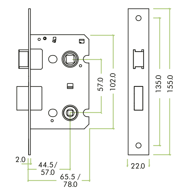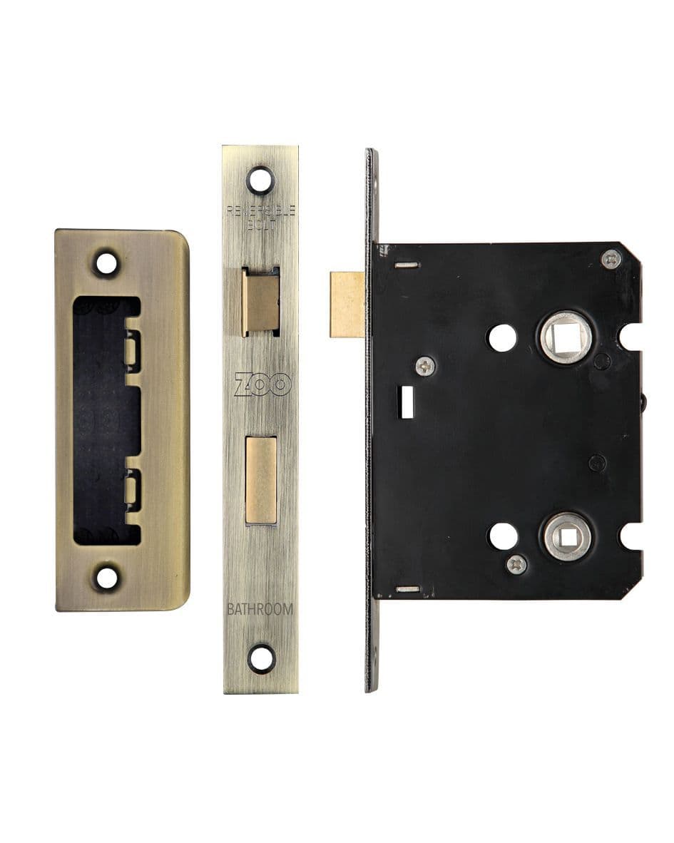 Bathroom sashlock designed for home use. 57mm centres for use on most standard UK sizes bathroom furniture. Can also be used with a lever on rose and bathroom turn. Supplied with matching faceplate and frame keep.